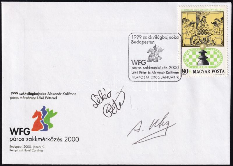 Lékó Péter (1979- ) és Alexander Khalifman (1966- ) nemzetközi sakk nagymesterek autográf aláírása alkalmi borítékon / Chess grandmasters' autograph signatures on special cover