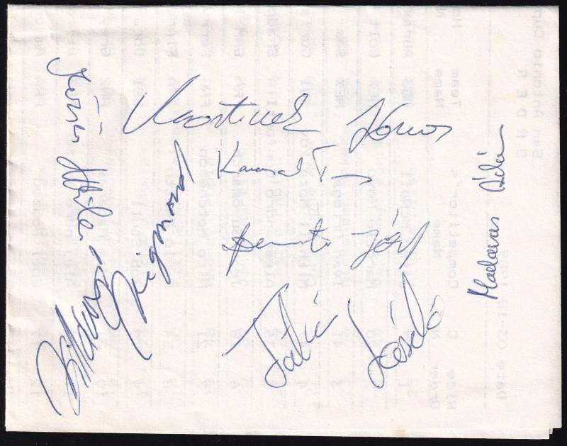 Leírás: Öttusázók aláírásai papírlapon: Madaras Ádám (1966- ), Martinek János (1965- ), Villányi Zsigmond (1950-1995), stb. (össz. 7 db aláírás)