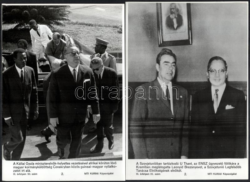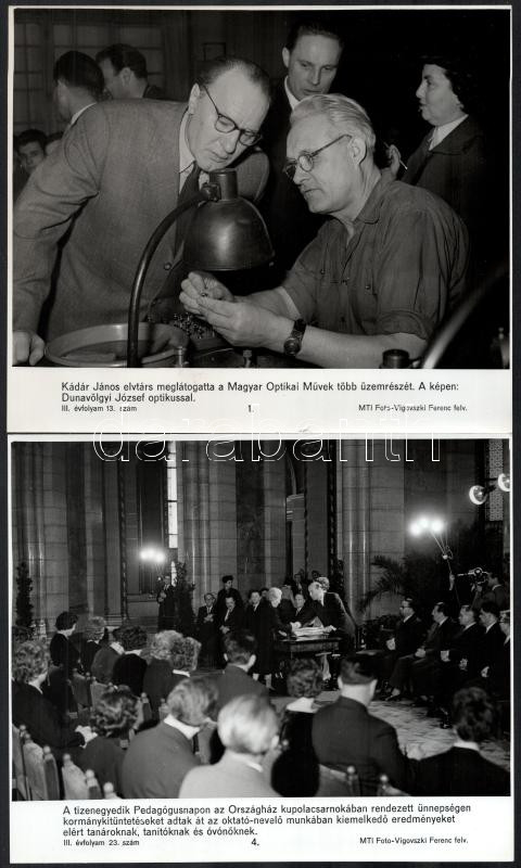 11 db MTI fotó. cca. 27x18,5 cm Olasz nehézipari kiállÃtást rendeztek a moszkvai Szokolnyiki-parkban. Hruscsov elvtárs megnyitó beszédében leszögezte: "Most az a fontos, hogy kereskedjünk". / Kádár János elvtárs Vas-megyei útja során a rurni Vörös Csillag TermelÅ‘szövetkezetbe is ellátogatott. Beszélgetett a 60 éves Derdák Lajos gazdával, aki tÃz éve tagja a termelÅ‘- szövetkezetnek. / A tizenegyedik Pedagógusnapon az Országház kupolacsarnokában rendezett ünnepségen kormánykitüntetéseket adtak át az oktató-nevelÅ‘ munkában kiemelkedÅ‘ eredményeket elért tanároknak, tanÃtóknak és óvónÅ‘knek. / Joszip Broz Tito, a Jugoszláv Szövetségi Népköztársaság elnöke és felesége, útban a Szovjetunió felé, kÃséretével átutazott hazánkon. A vendégek tiszteletére adott vacsorán Dobi István, Kádár János és Joszip Broz Tito. / Május 1.-én Moszkvában, a Vörös-téren rendezett impozáns dÃszszemlén elsÅ‘ Ãzben mutatták be az interkontinentális rakétákat. / Kádár János elvtárs meglátogatta a Magyar Optikai Művek több üzemrészét. A képen: Dunavölgyi József optikussal. / Kiválóan dolgozó nÅ‘ket tüntetett ki az Elnöki Tanács a NÅ‘nap alkalmából. Marosán György elvtárs a kitüntetett nÅ‘k egy csoportjával. / Tanácskozik a Magyar Szocialista Munkáspárt VIII. Kongresszusa. / A békét fenyegetÅ‘ párizs-bonni atomtengely de Gaulle nyugatnémetországi látogatásával tovább erÅ‘södött. / A Szovjetunióban tartózkodó U Thant, az ENSZ ügyvezetÅ‘ fÅ‘titkára a Kremlben meglátogatta Leonyid Brezsnyevet, a Szovjetunió LegfelsÅ‘bb Tanácsa Elnökségének elnökét. / A Kállai Gyula miniszterelnök-helyettes vezetésével afrikai körúton lévÅ‘ magyar kormányküldöttség Conakryban közös guineai-magyar nyilatkozatot Ãrt alá.
