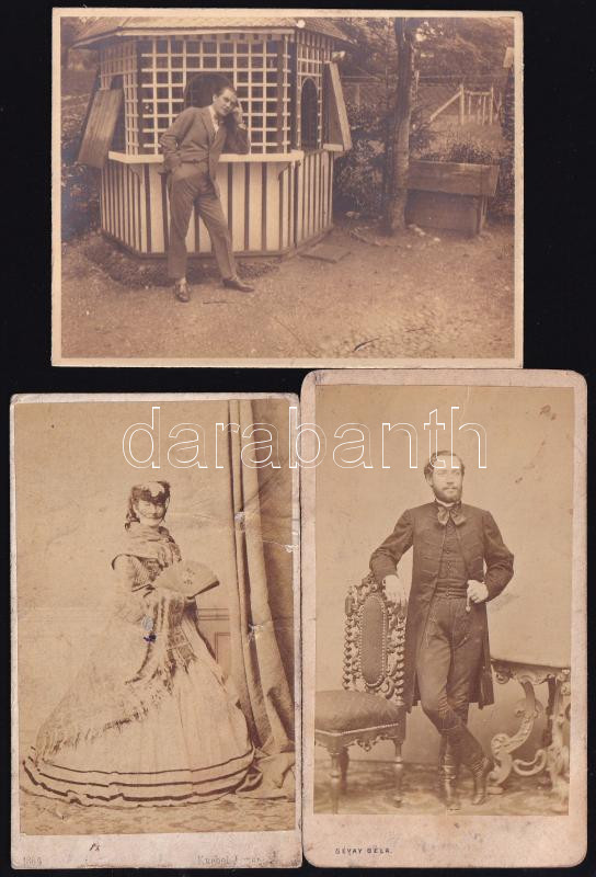 Leírás: cca 1870 2 db vizitkártya Knebel F. és Gévay Béla. + 1 1930 ból származó fotó