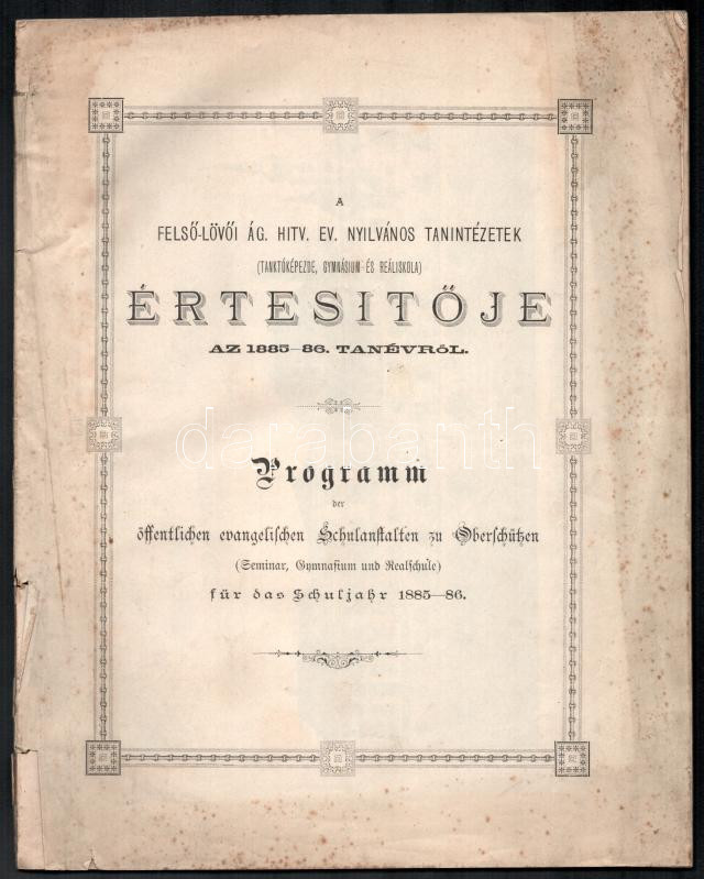 Leírás: Felső-lövő ág. hitv, nyilvános tanintézetek értesítője 1885-86. tanévről 63p. Kis szakadással
