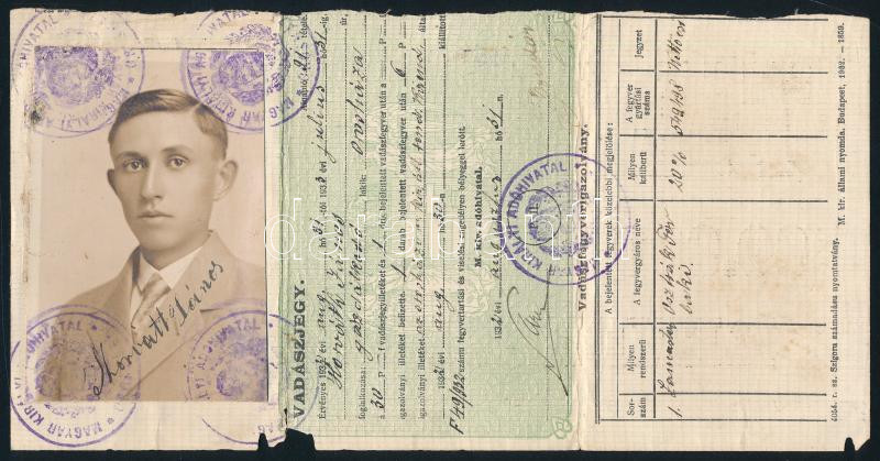 Leírás: 1932 Fényképes vadászjegy orosházi gazdálkodó részére