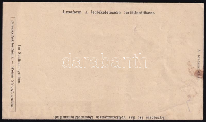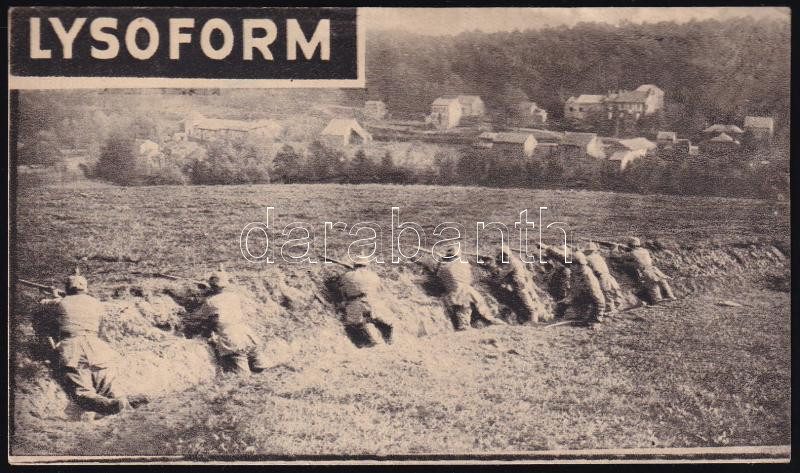 Leírás: Lysoform fertőtlenítőszer számolócédula, lövészárokban lévő katonák fotójával illusztrált