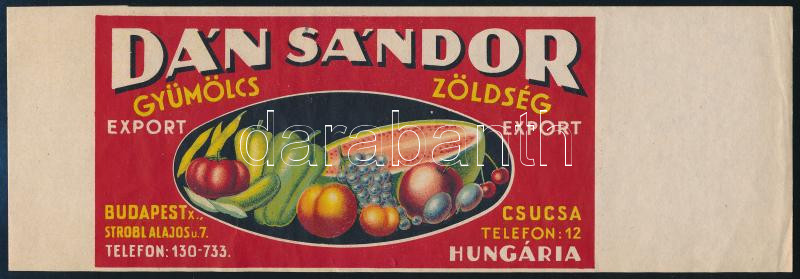 cca 1940 Dán Sándor gyümölcs-zöldség export konzerv címke, 26,5x9 cm https://www.darabanth.com/hu/438-Gyorsarveres/438.0/Mutargy-papirregiseg-egyeb/Reklam~500024/cca-1940-Dan-Sandor-gyumolcs-zoldseg-export-konzerv-cimke-26-5x9-cm~II2867563