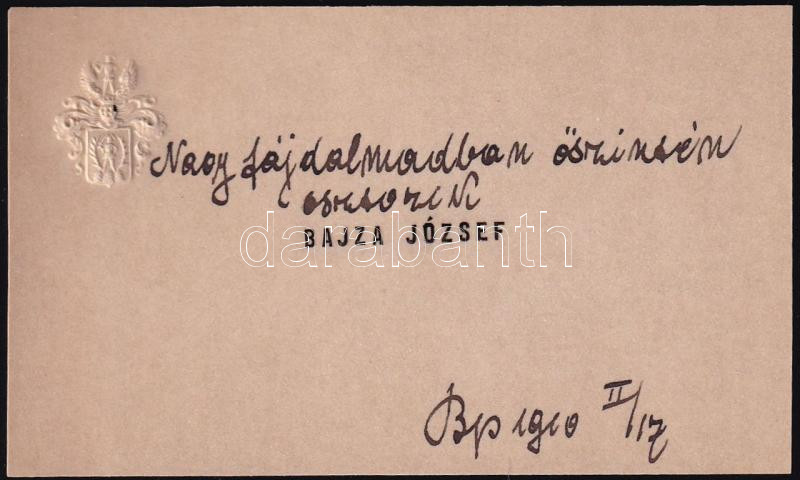 Leírás: 1910 Bajza József autográf feliratos dombornyomott címeres névjegye