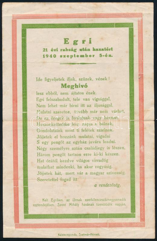 Leírás: 1940 Egri (Kárpátalja) hazatért. A falu visszacsatolásának alkalmából rendezett ünnepség szórólapja