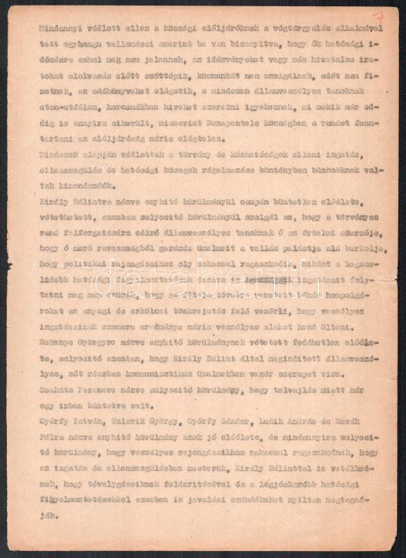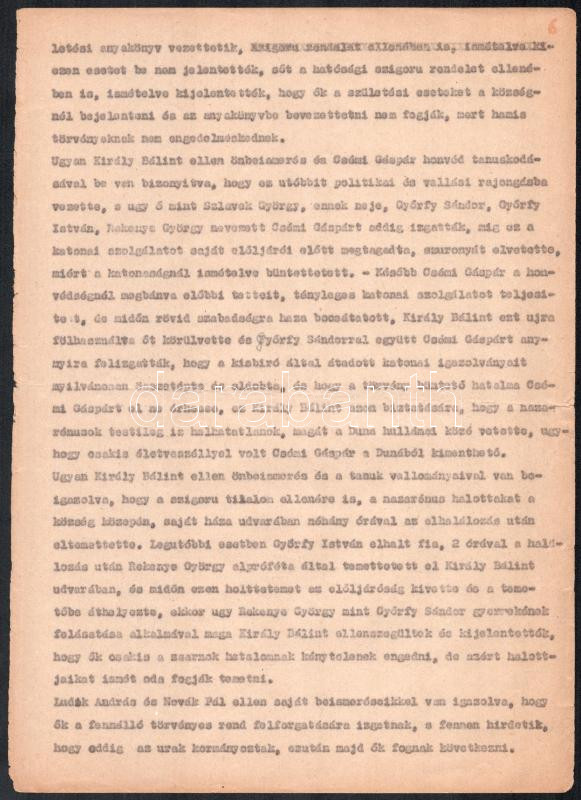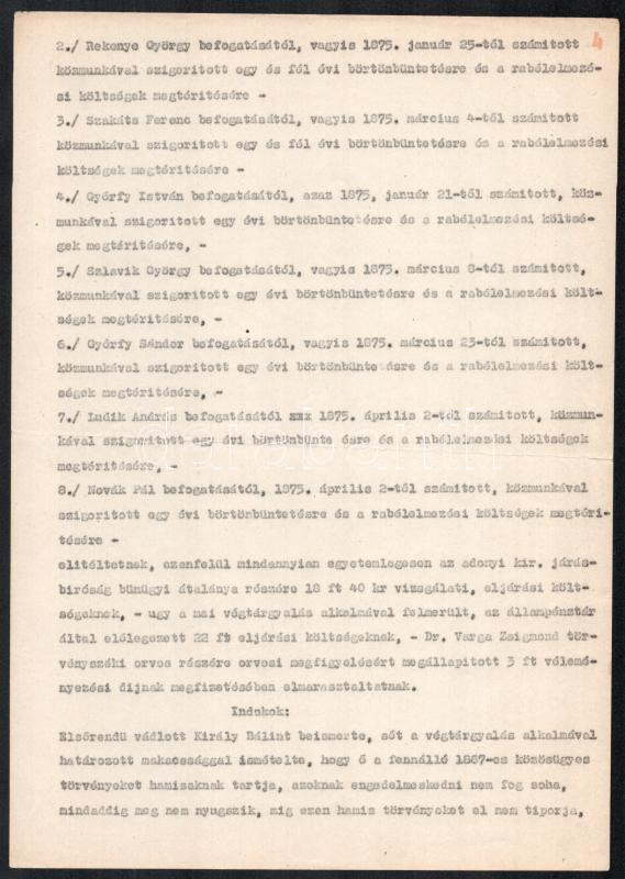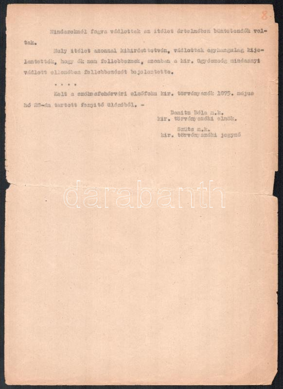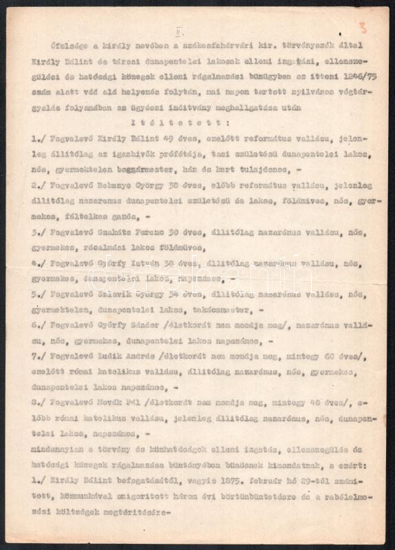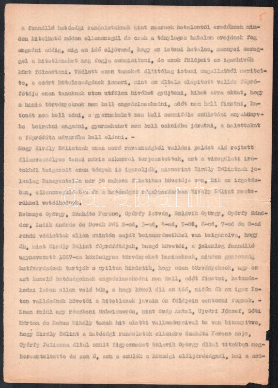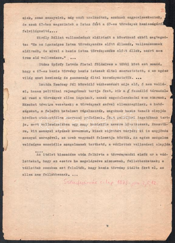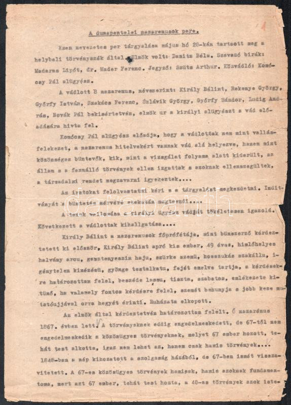 "A dunapentelei nazarenusok pere", a székesfehérvári kir. törvényszéken 1875-ben lezajlott tárgyalás összefoglalása és az ítélet leírása; későbbi, gépelt átirat 8 oldalon, részben kissé sérült lapok