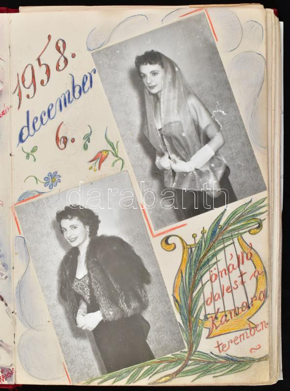 Antal Lívia (1929-2001) koncerténekesnő 1959., 1960., 1961. évi fellépéseiről 10 fotóval naplószerűen feldolgozott újságcikkek, szórólapok, műsorfüzetek, meghívók, plakátok, kézzel festett színes képekkel díszítve, saját kézzel írt sorai a Kodály Zoltán lakásán tartott énekbemutatójáról, stb.