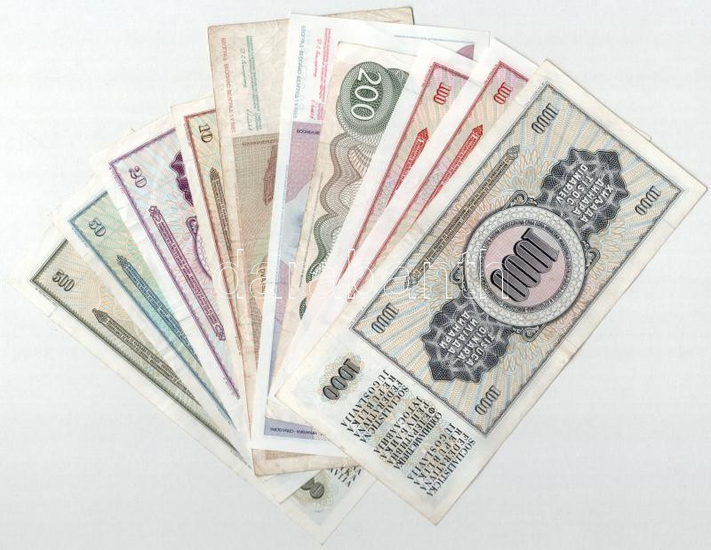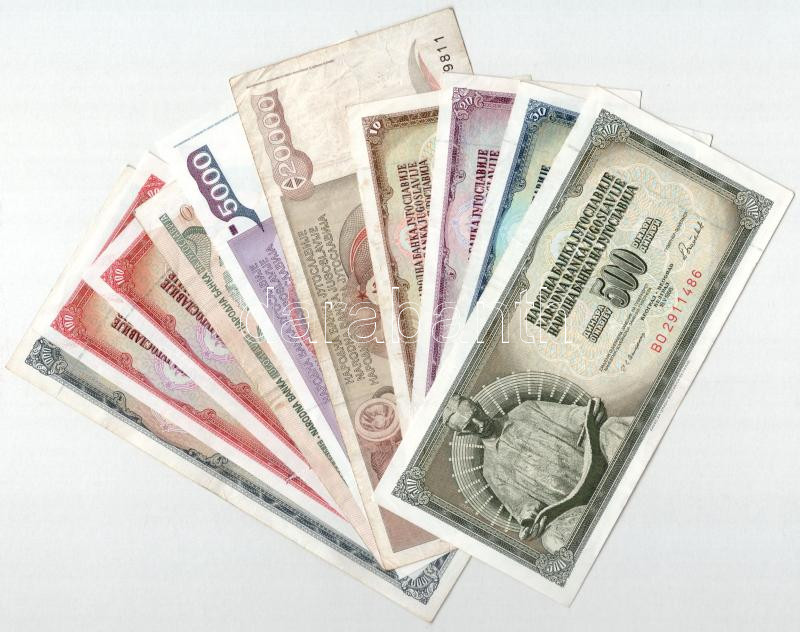 10db-os vegyes jugoszláv bankjegy tétel, közte 1986. 100D (2x) sorszámkövetők "CM 3859281 - CM 3859282" T:XF-F közte folt