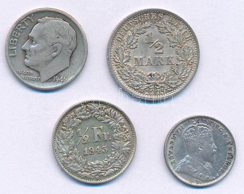 Vegyes: Amerikai Egyesült Államok 1946. 1d Ag "Roosevelt" + Német Birodalom 1915A 1/2M Ag + Svájc 1943. 1/2Fr Ag + Straits Settlements 1903. 5c Ag "VII. Eduárd" T:XF,VF patina