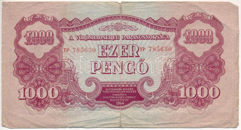 Leírás: 1944. 1000P "A Vörös Hadsereg Parancsnoksága" "TP 785630" T:VG beszakadások, kis anyaghiány Adamo P48