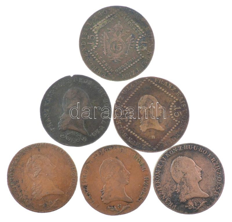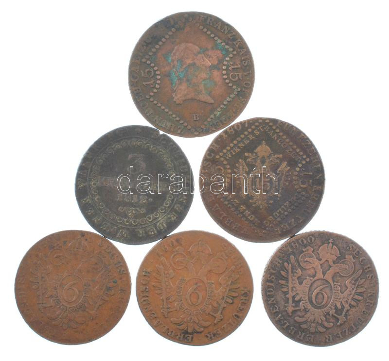 1800-1812. 3kr-15kr (6xklf) klf verdejelekkel, közte 1800E 6kr Cu &quo... https://www.darabanth.com/hu/438-Gyorsarveres/438.0/Numizmatika/Magyar-es-magyar-verdejelu-fem-es-ezustpenzek~1500008/1800-1812-3kr-15kr-6xklf-klf-verdejelekkel-kozte-1800E-6kr-Cu-I-Ferenc-1812E-3kr-Cu-I-Fer~II2857004