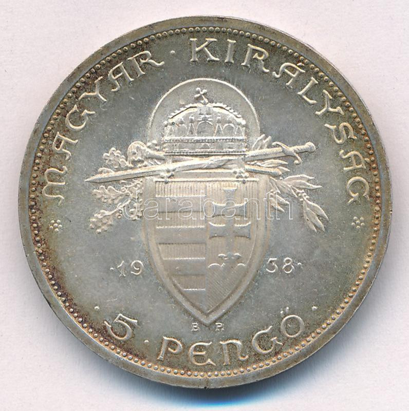 Adamo P8.1 https://www.darabanth.com/hu/438-Gyorsarveres/438.0/Numizmatika/Magyar-es-magyar-verdejelu-fem-es-ezustpenzek~1500008/1938-5P-Ag-Szent-Istvan-TAU-XF-patina-ph--Adamo-P81~II2866745