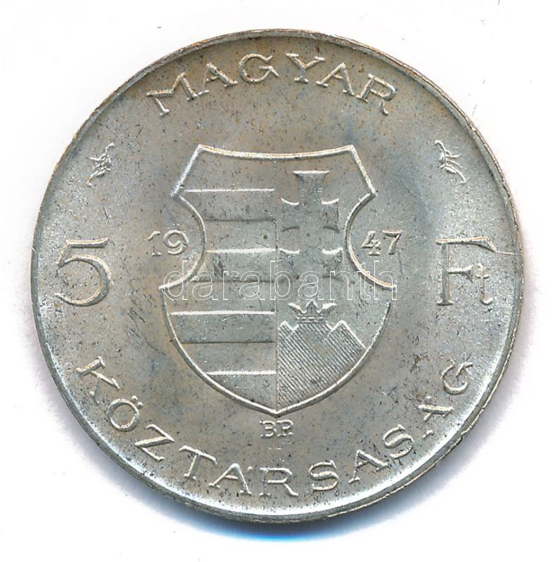 1947. 5Ft Ag "Kossuth" T:AU patina Adamo F8.1 https://www.darabanth.com/hu/438-Gyorsarveres/438.0/Numizmatika/Magyar-es-magyar-verdejelu-fem-es-ezustpenzek~1500008/1947-5Ft-Ag-Kossuth-TAU-patina-Adamo-F81~II2855538