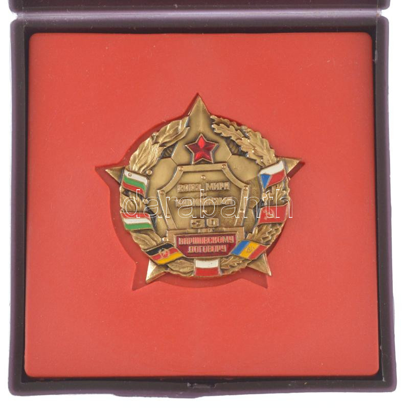 Szovjetunió 1985. "30 éves a Varsói Szerződés" aranyozott, részben festett és zománcozott jelvény eredeti tokban T:UNC