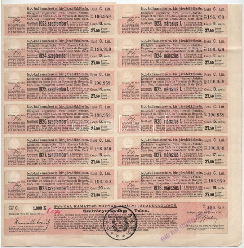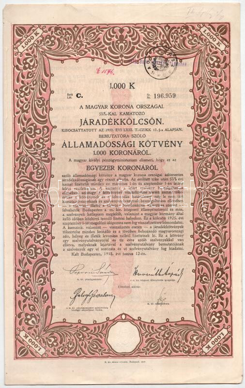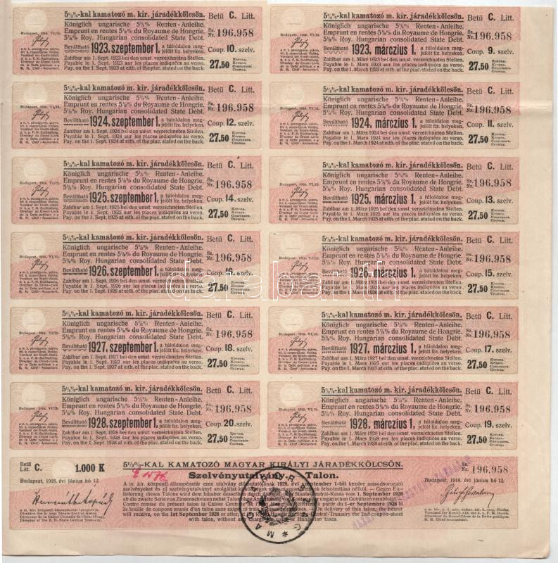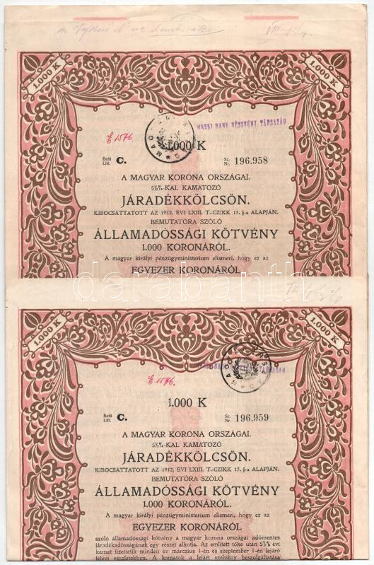 Budapest 1918. "A Magyar Korona Országai 5 1/2%-kal kamatozó járadékkölcsön" államadóssági kötvénye 1000K-ról (2x) sorszámkövetők "C 196.958 - C 196.959" szelvényekkel, bélyegzéssel, szárazpecséttel T:VF folt