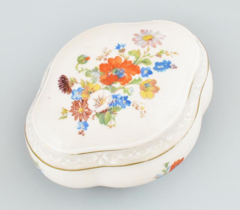 Leírás: Drasche porcelán bonbonier. Részben kézzel festett, jelzett, minimális kopással, 11x9x7 cm