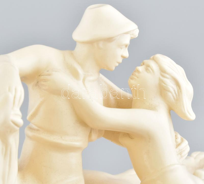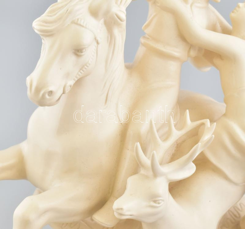 Leírás: Szerelmes pár szarvason és lovon, fehér mázas fajansz, restaurált, m. 35 cm, h: 38 cm