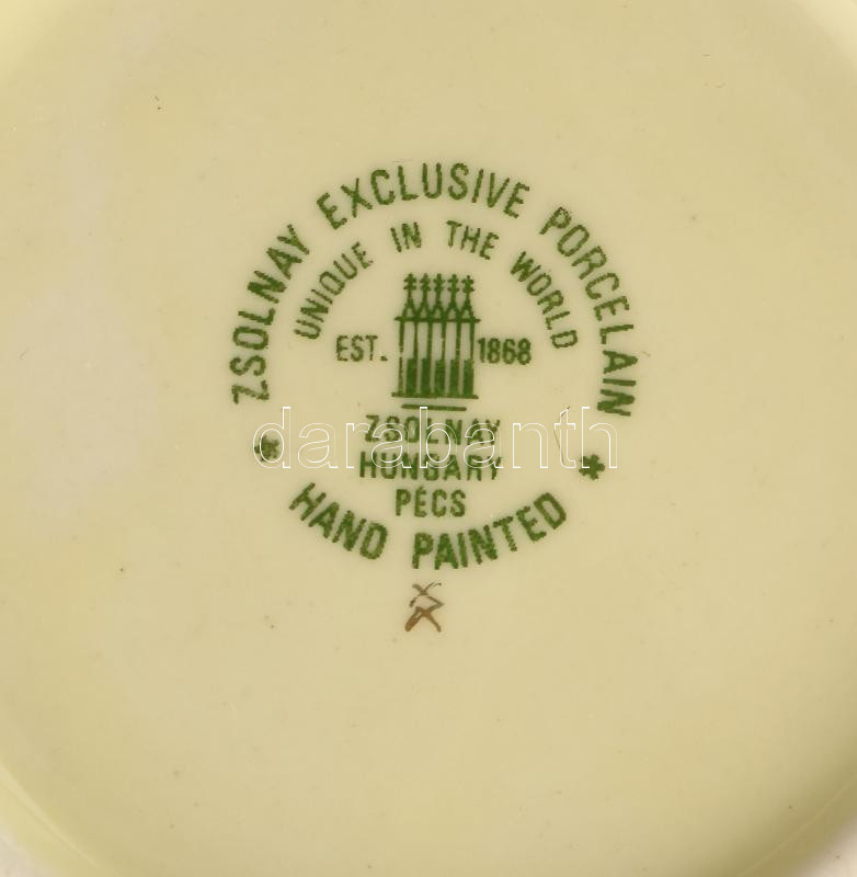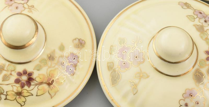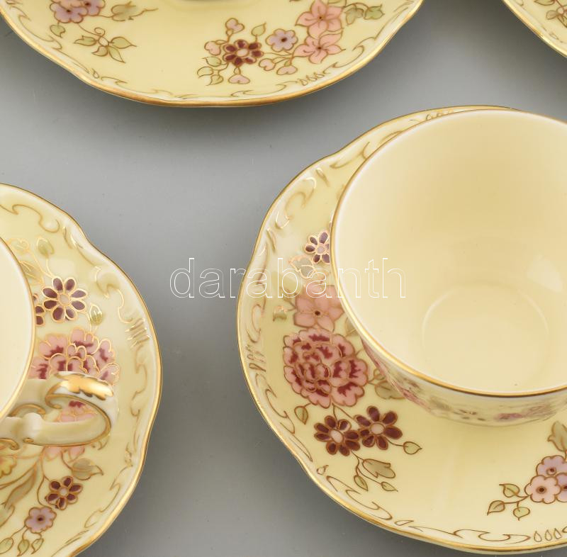 Zsolnay virágmintás kávés csésze, 6 db csésze, és alj, 4 tetővel, kézzel festett, jelzett, kis kopásnyomokkal, alj: d:12 cm, csésze: m: 4,5 cm, tető: 7,5 cm