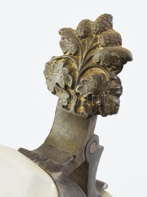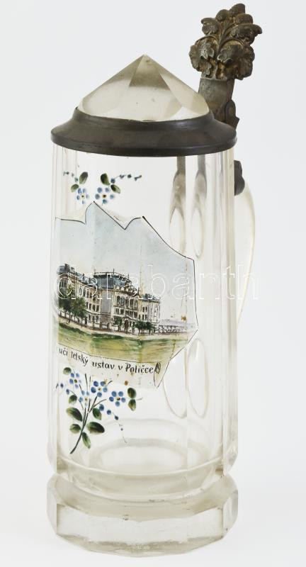 Leírás: Antik üveg korsó, üvegbetétes ón fedővel, korának megfelelő kopásokkal, m: 23 cm