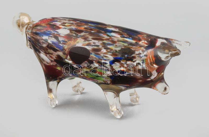 Leírás: Muránói színes üveg malac, farka sérült, h: 11,5 cm