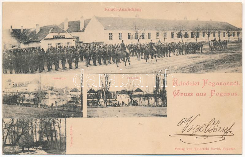 1899 (Vorläufer) Fogaras, Fagaras; Parade-Ausrückung, Kaserne, Schloss, Papier-Mühle / Katonai felvonulás, laktanya, Apafi kastély, papírmalom, papírgyár. Thierfeld Dávid kiadása / K.u.K. military parade, barracks, castle, paper mill (EK)