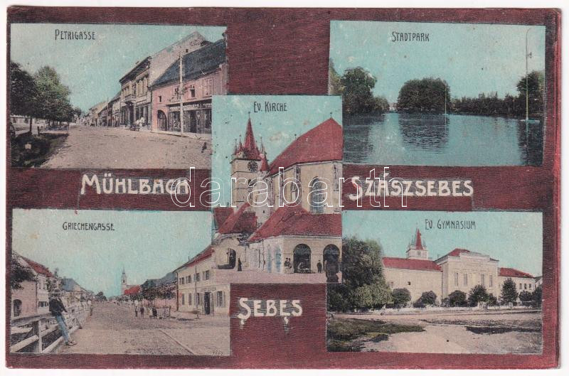 1909 Szászsebes, Mühlbach, Sebesul Sasesc, Sebes; Petrigasse, Ev. Kirche, Stadtpark, Ev. Gymnasium, Griechengasse / utca, evangélikus templom és iskola, park / streets, church and school, park