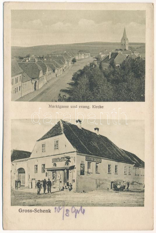1916 Nagysink, Gross-Schenk, Cincul Mare, Cincu; Marktgasse und evang. Kirche / Fő utca, evangélikus templom, Gustav Salmen üzlete és saját kiadása / main street, Lutheran church, publisher's shop (ázott / wet damage)