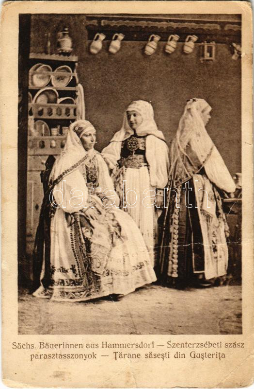 Leírás: 1917 Szenterzsébet, Szenterszebet, Hammersdorf, Gusterita (Nagyszeben, Sibiu); Sächsische Bäuerinnen / Szenterzsébeti szász parasztasszonyok, erdélyi folklór. Jos. Drotleff Nr. 415. / Transylvanian Saxon folklore (fa)