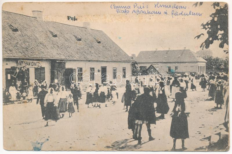 Leírás: 1933 Puj, Pui; Piac tér, Takarékpénztár részvénytársaság, Ábrahám Ignácz üzlete / shop, market square, savings bank (felületi sérülés / surface damage)