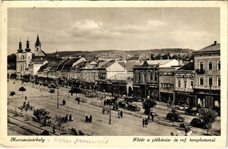 1941 Marosvásárhely, Targu Mures; Fő tér, plébánia és református templom, automobilok, üzletek / main square, Calvinist church and parish, automobiles, shops (fa)