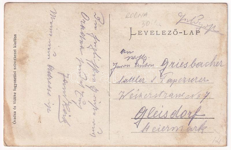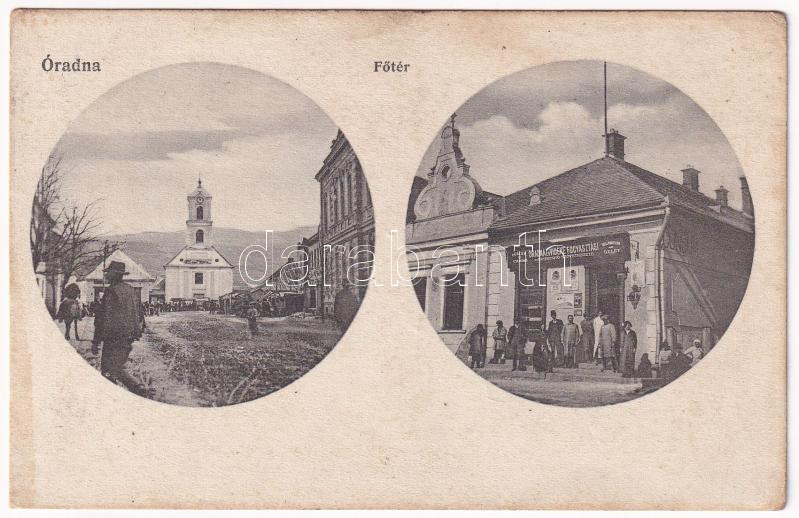 Leírás: Óradna, Alt-Rodna, Radna veche, Rodna; Fő tér, templom, fogyasztási és értékesítő szövetkezet üzlete / main square, church, cooperative shop (fl)