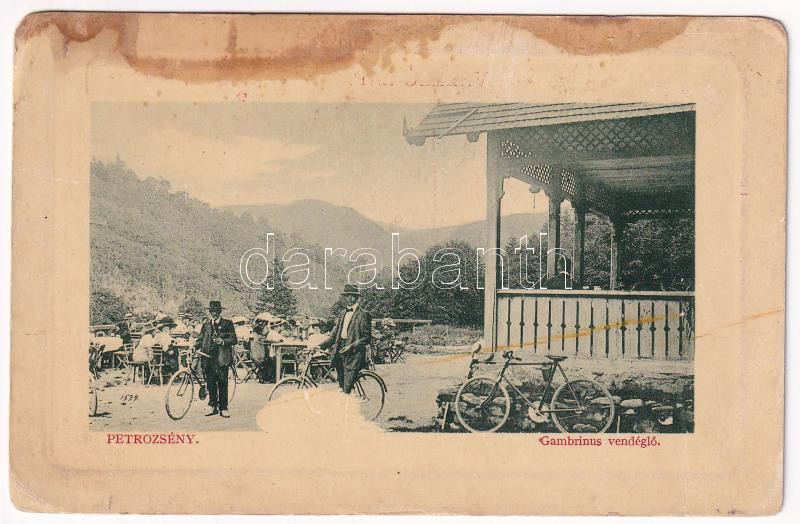 Petrozsény, Petrosani; Gambrinus vendéglő, étterem, férfiak kerékpárra... https://www.darabanth.com/hu/439-Gyorsarveres/439.0/Kepeslapok/Erdely~2000007/Petrozseny-Petrosani-Gambrinus-vendeglo-etterem-ferfiak-kerekparral-WL-Bp-5400-1911-~II2877999
