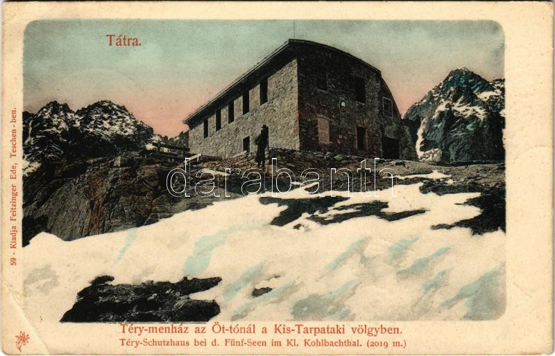 Tátra, Magas-Tátra, Vysoké Tatry; Téry menház az Öt-tónál a Kis-Tarpataki völgyben. Feitzinger Ede kiadása / Téry-Schutzhaus bei d. Fünf-Seen im Kl. Kohlbachthal / rest house (Rb)