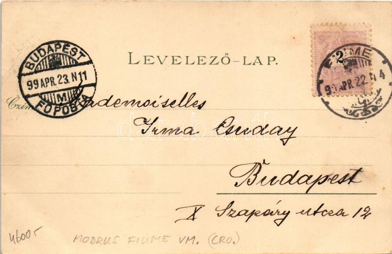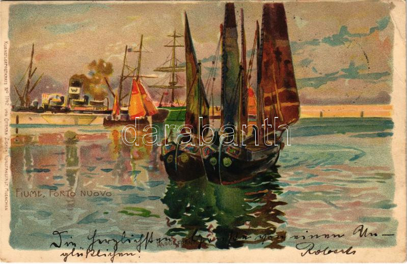 Leírás: 1899 (Vorläufer) Fiume, Rijeka; Porto Nuovo / port and sailing ships. Kuenstlerpostkarte No. 1142. von Ottmar Zieher litho s: Raoul Frank (EB)