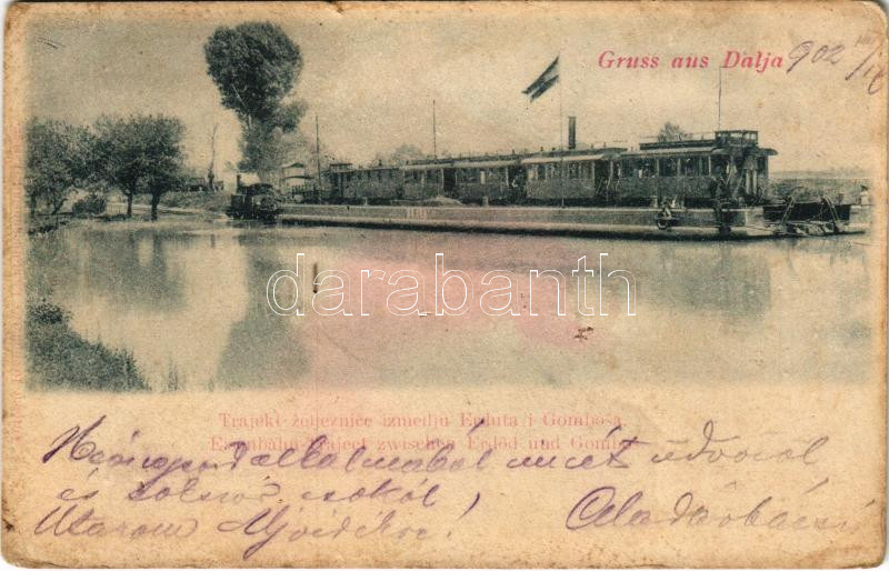 1902 Dálya, Dalja, Dalj; Gőzkomp Gombos és Erdőd között a szabad Dunán, gőzmozdony kompra állítása. Kiadja Selzer és Rank / Eisenbahn-Traject zwischen Erdőd und Gombos auf der Donau / steam ferry with freight train between Bogojevo and Erdut on the Danube, locomotive (b)