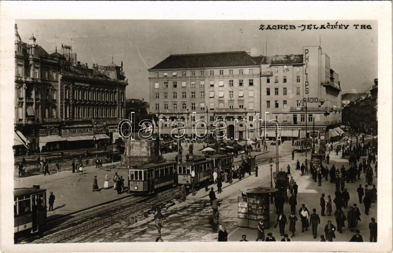 Leírás: Zagreb, Zágráb; Jelacicev trg / Jellasics tér és szobor, villamosok, üzletek / square, monument, tram, shops, Philips Radio. photo