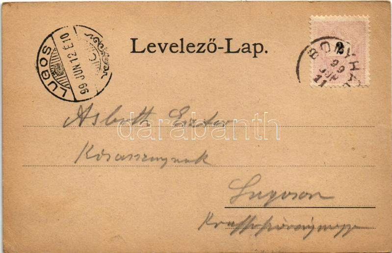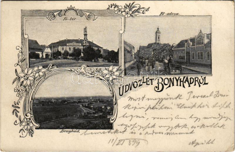 Leírás: 1899 (Vorläufer) Bonyhád, Fő utca és tér, látkép. Art Nouveau, floral (EK)