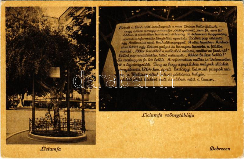 Debrecen, Liciumfa és szövegtáblája (EK) https://www.darabanth.com/hu/439-Gyorsarveres/439.0/Kepeslapok/Magyarorszag~2000006/Debrecen-Liciumfa-es-szovegtablaja-EK~II2875955