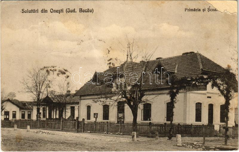 Leírás: Onesti, Ónfalva, Onyest (Bacau); Primaria si Scoala / town hall and school (surface damage)