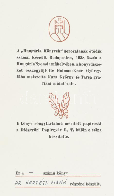 Adassék e levél... Régi és új magyar szerelmes levelek 1528-1938. Összeáll.: Bisztrai Farkas Ferenc. Illyés Gyula bevezetőjével. Hungária Könyvek 5. Bp.,1938, Hungária-ny. A könyvdíszeket összegyűjtötte Haiman-Kner György, fába metszette Kaza György és Társa grafikai műintézete. Kiadói félvászon-kötés, jó állapotban. Számozatlan, Dr. Kertész Manó nevére szóló példány.