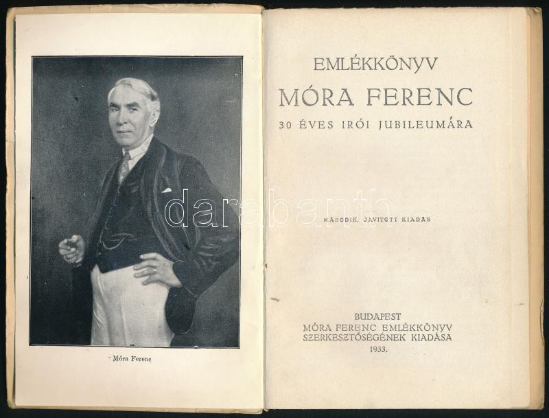 Leírás: Emlékkönyv Móra Ferenc 30 éves irói jubileumára. Bp., 1932, Móra Ferenc Emlékkönyv Szerkesztősége. Fekete-fehér fotókkal illusztrált. Kiadói papírkötés, kissé gyűrött széllel