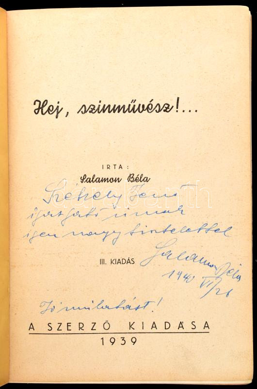 Leírás: Salamon Béla: Hej színművész!... A szerző, Salamon Béla (1885-1965) által DEDIKÁLT példány. Bp., 1939, Szerzői kiadás. Első kiadás! Kiadói illusztrált egészvászon-kötésben