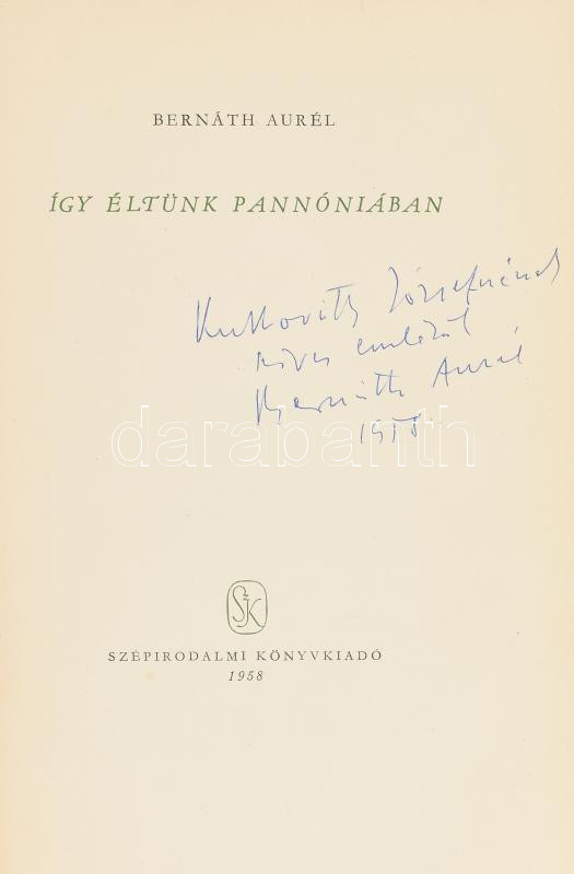 Leírás: Bernáth Aurél: Így éltünk Pannóniában. Kor és pálya. Bp., 1958, Szépirodalmi kiadó. Kiadói egészvászon-kötés. DEDIKÁLT példány