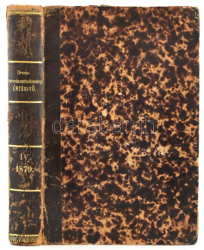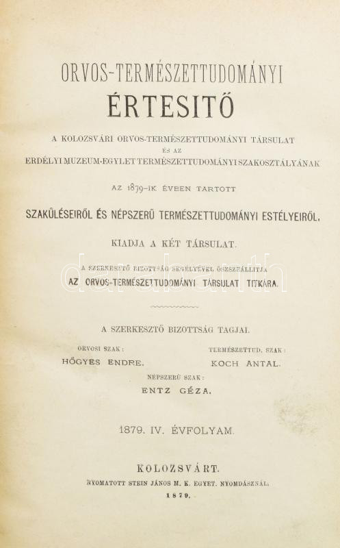Orvos-Természettudományi Értesítő a Kolozsvári Orvos-Természettudományi Társulat és az Erdélyi Muzeum-Egylet Természettudományi Szakosztályának az 1879-ik évben tartott szaküléseiről és népszerű természettudományi estélyeiről. Kiadja a két társulat. A szerk. bizottság segélyével összeállítja az Orvos -Természettudományi Társulat Titkára. A szerk. bizottság tagjai: orvosi szak: Hőgyes Endre, természettud. szak: Koch Antal, népszerű szak: Entz Géza. 1879 IV. évf. évf. I. Orvosi szak. I. köt. 1. füzet. II. Természettudományi szak. I. kötet. 1. füzet. III. Népszerű előadások. I. köt. 1. füzet. Kolozsvár, 1879., Stein János, VIII+246 p.+VI t.; 208 p.+I t.; 124 p. Korabeli aranyozott gerincű félbőr-kötésben, kopott borítóval, két tábla és egy lap kijár, egy táblán szakadással.