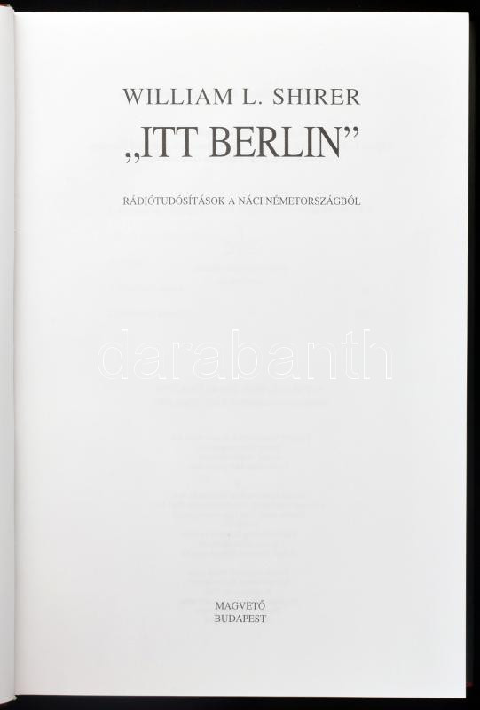 Leírás: William L. Shirer: ,,Itt Berlin". Rádiótudósítások a náci Németországból. Ford.: Kállai Tibor. Bp., 2001, Magvető. Kiadói kartonált papírkötés, kiadói papír védőborítóban.