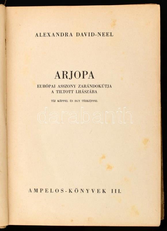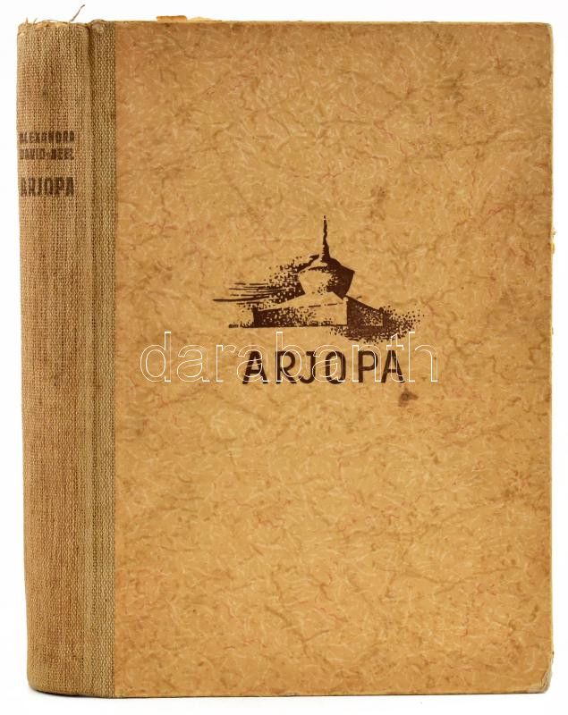 David-Neel, Alexandra: Arjopa. Európai asszony zarándokútja a tiltott Lhászába. Ampelos-Könyvek III. Ford.: Kemény Katalin. Debrecen, [1943], Pannonia Könyvnyomda, 288+(1) p. + 8 t. Egészoldalas fekete-fehér fotókkal illusztrált. Kiadói félvászon-kötés, kissé sérült borítóval.