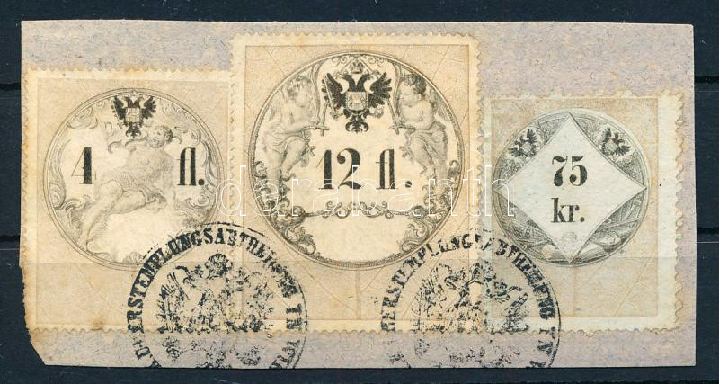 1858 4fl, 12fl és 75kr kivágáson https://www.darabanth.com/hu/439-Gyorsarveres/439.0/Magyar-filatelia-es-postatortenet/Okmanybelyegek~1000019/1858-4fl-12fl-es-75kr-kivagason~II2880054