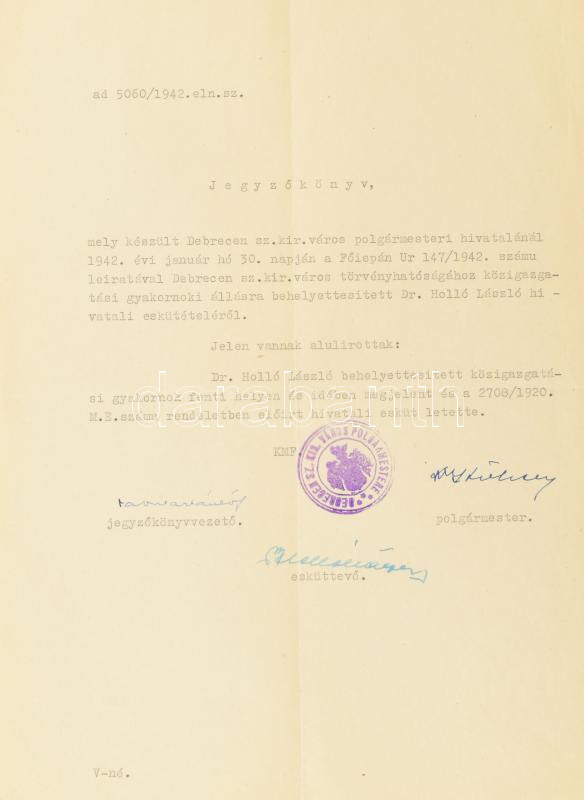 Leírás: 1942 Kölcsey Sándor Debrecen polgármestere által aláírt okirat, jegyzőkönyv.