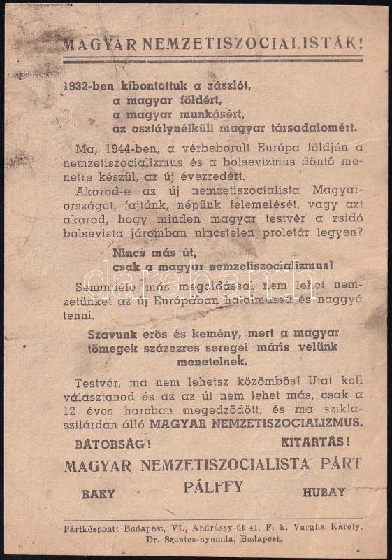 cca 1936 Magyar Nemzeti Szocialista Párt röplap, piszkos 10x15 cm https://www.darabanth.com/hu/439-Gyorsarveres/439.0/Mutargy-papirregiseg-egyeb/Alairas~1000022/cca-1936-Magyar-Nemzeti-Szocialista-Part-roplap-piszkos-10x15-cm~II2882073